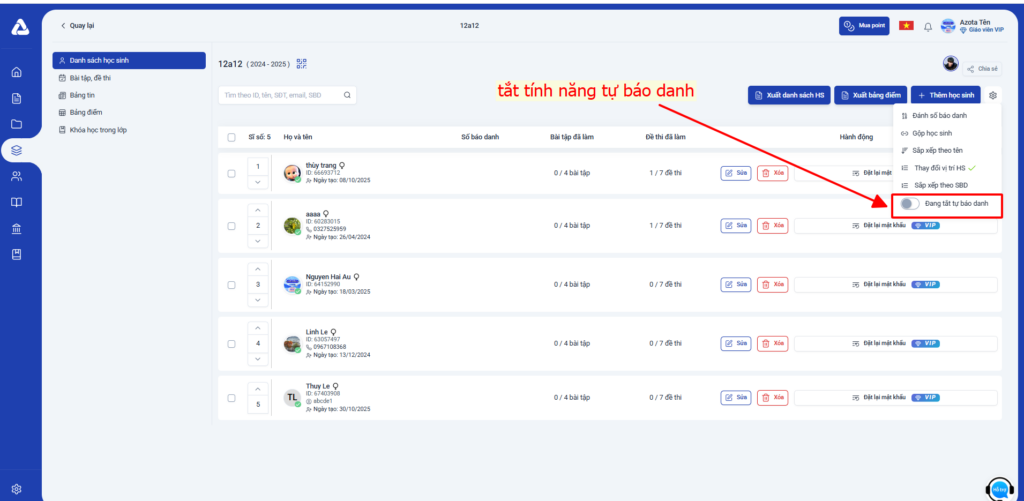 • Tùy chọn B: Giáo viên cập nhật thông tin tài khoản của học sinh (với học sinh đã tự đăng ký trên Azota) để đảm bảo tất cả tài khoản đều có tick xanh định danh.