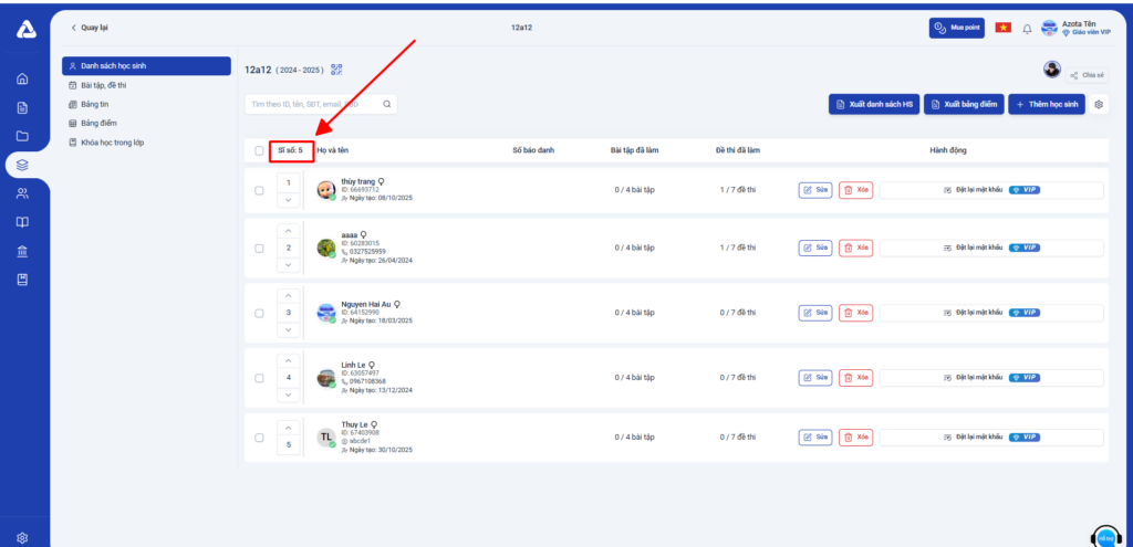 Truy cập vào lớp học trên Azota → xem mục “Sĩ số”