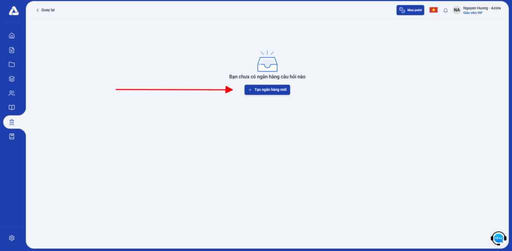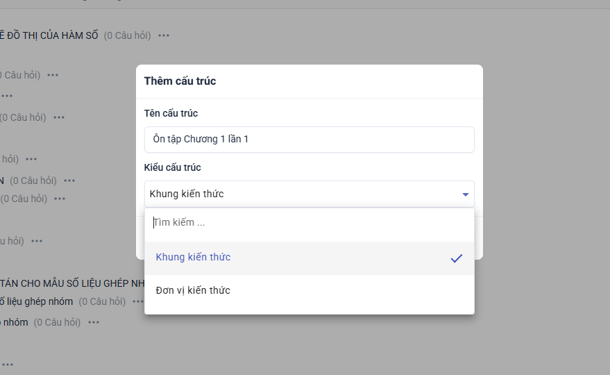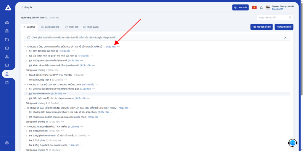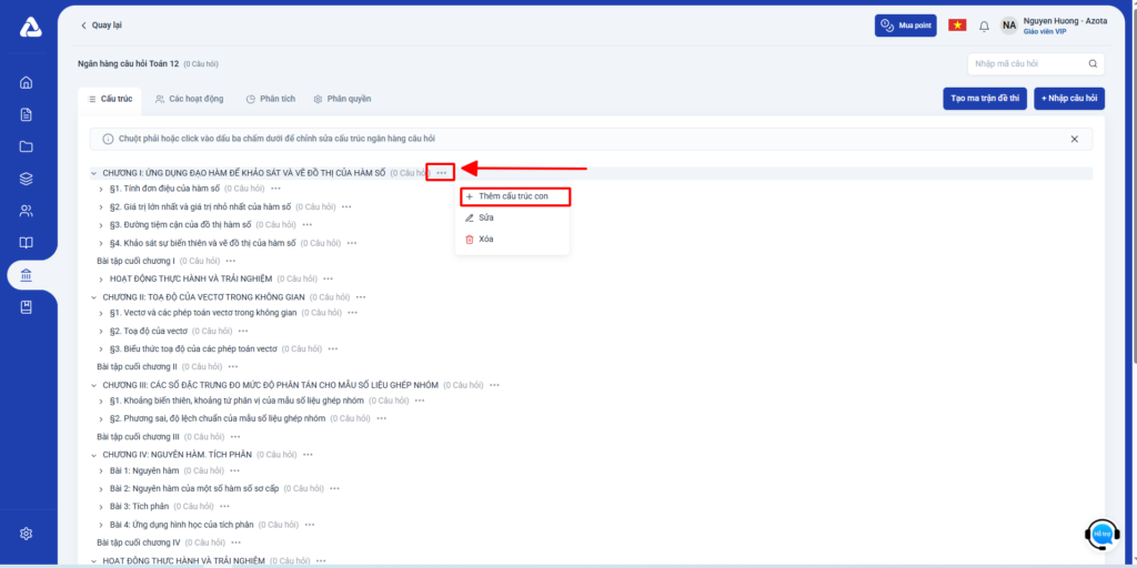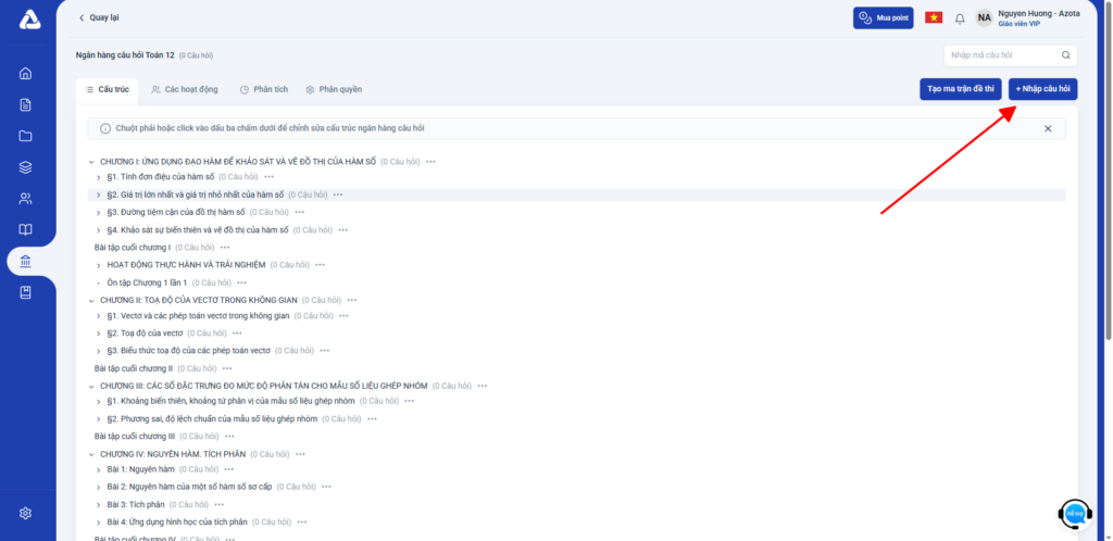 Sau khi tạo thành công Cấu trúc ngân hàng, bạn cần thêm câu hỏi vào từng Chương/bài trong Khung kiến thức
