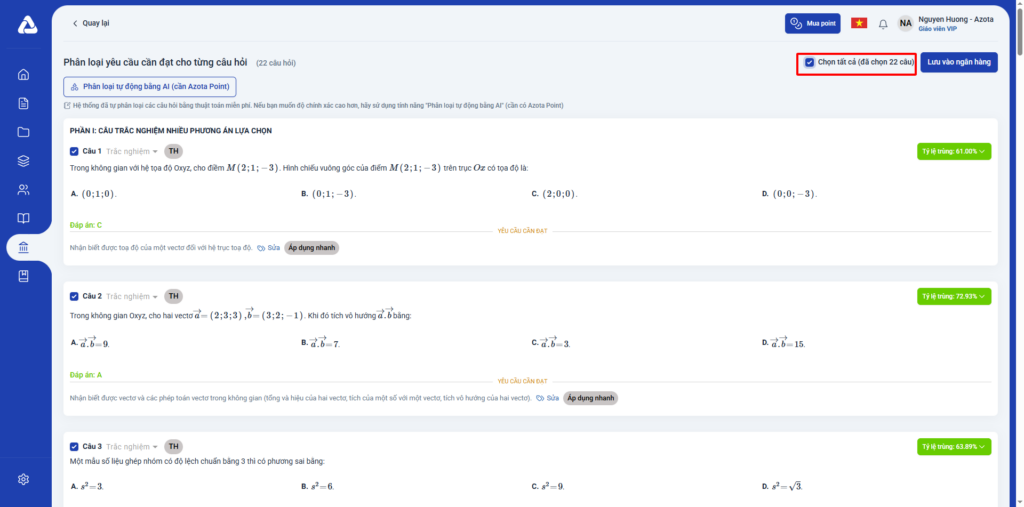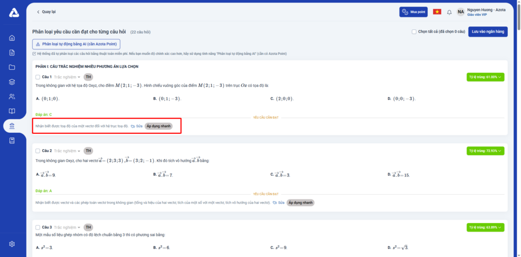 Hệ thống sẽ mặc định tự động phân loại yêu cầu cần đạt ở mỗi câu hỏi dựa trên nội dung câu hỏi. Tuy nhiên, với những câu hỏi mang tính suy luận phức tạp, bạn có thể cần sử dụng AI để phân loại