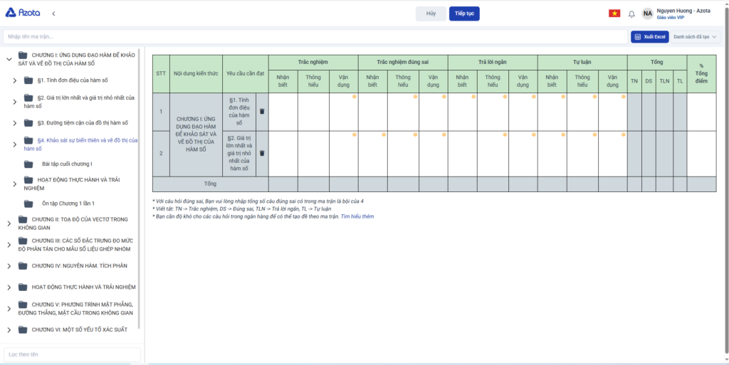 Chọn đơn vị kiến thức bên trái. Sau đó nhập số tại bảng ma trận để nhập lệnh lấy số câu tương ứng với đơn vị kiến thức đã chọn