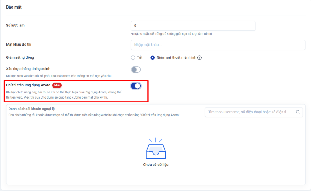 Với trường hợp thiết bị di động của học sinh không tải được App, giáo viên có thể tạo danh sách ngoại lệ (những tài khoản ngoại lệ vẫn được tham gia thi trên web)