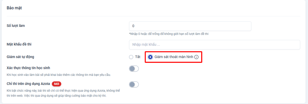 Giáo viên phải bật cấu hình: “Giám sát thoát màn hình” (Trong phần Cài đặt bài làm online)